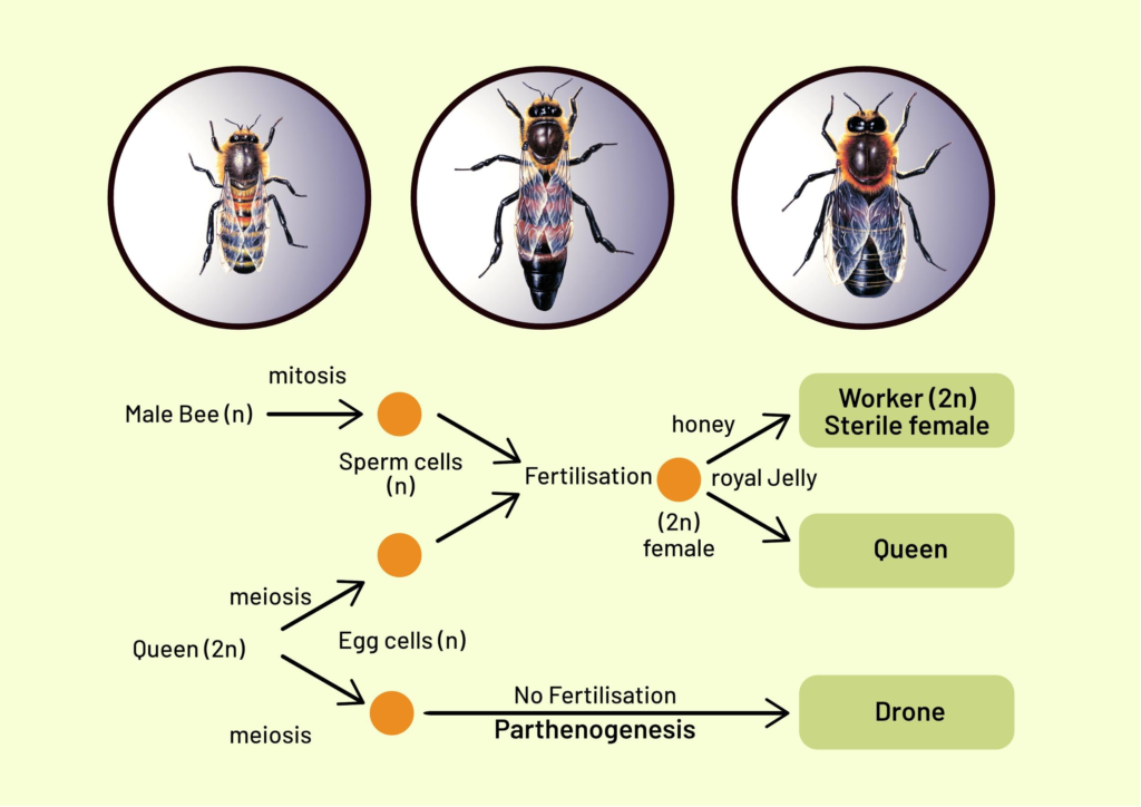 The reason male bees have no fathers comes down to a fascinating process called parthenogenesis. This is where an egg develops into an embryo without being fertilized. Consequently, drones are ultimately the result of a queen’s solo act. Surprisingly, only males are born out of parthenogenesis, the females are a result of the funny buzinezz.